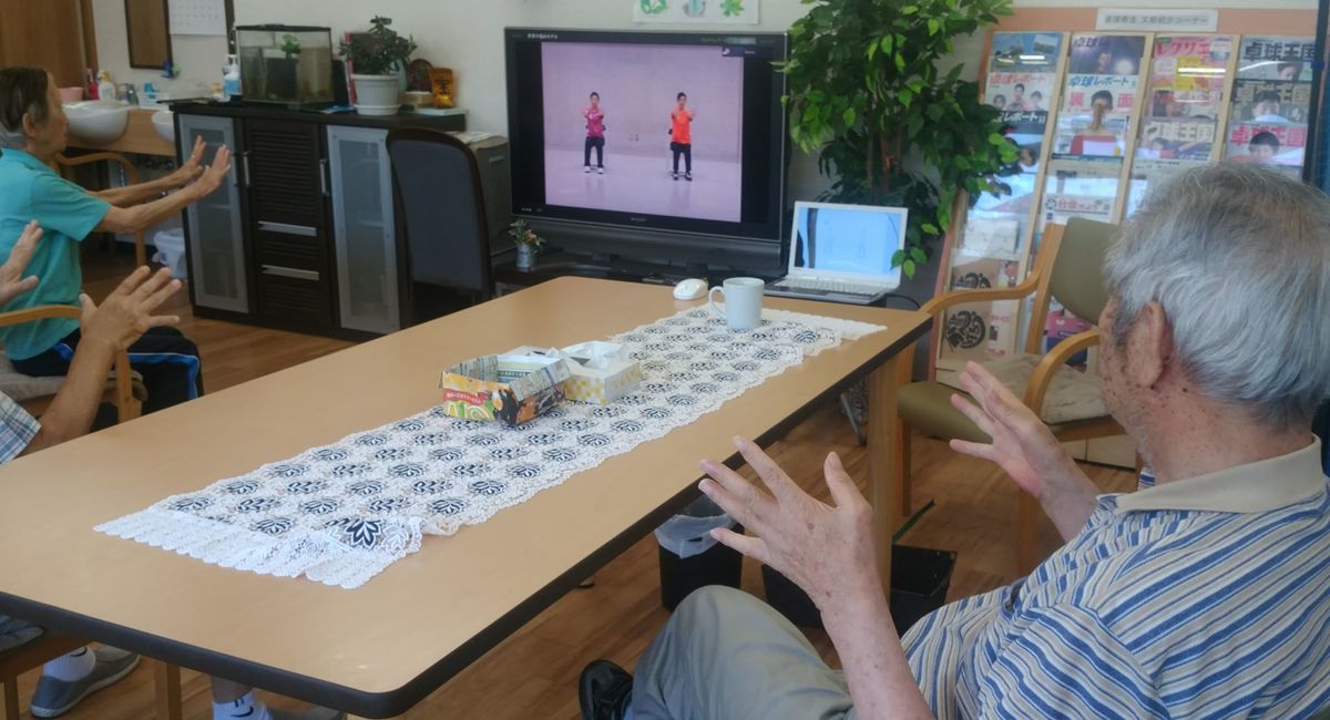 個別対応がほとんどの介護のハッピー合同会社のデイサービスにおいても「やまといきいき健康体操」はみんなで身体を動かす時間となっています。