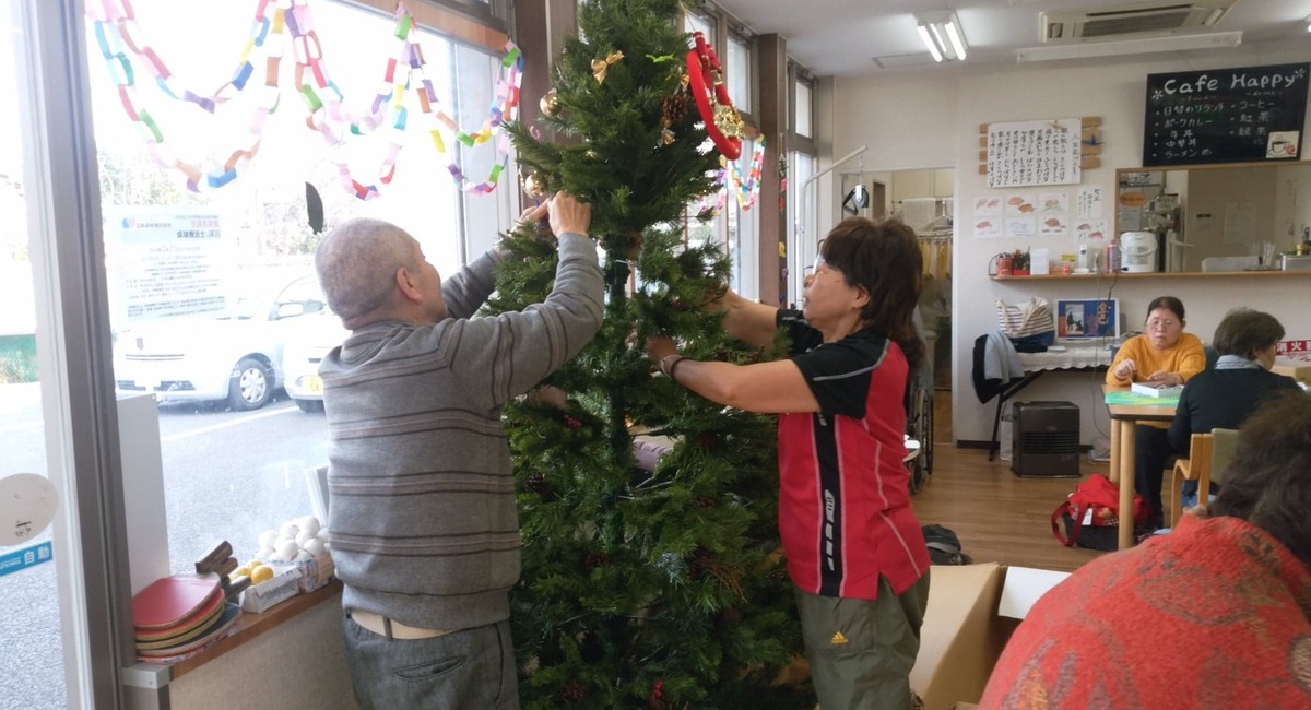 高座渋谷のピンポンデイハッピー渋谷に飾ってあった「ジャンボ・クリスマスツリー」も本日お役御免。利用者さまと一緒に片づけています。