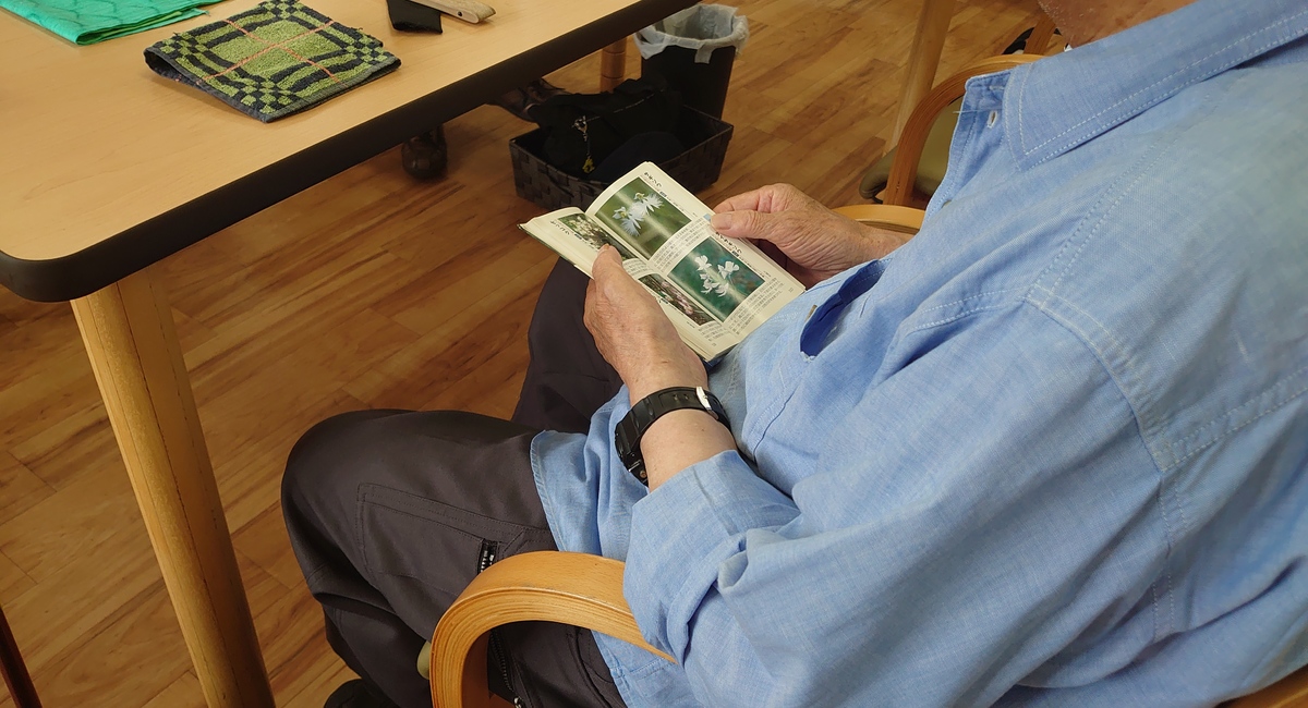 写真の男性は、身近に咲く野花の図鑑を熱心に読んでいます。施設の周りには引地川や若宮八幡宮の境内など植物が多く見られる環境です。図鑑を片手に野花をみんなで見るのも楽しそうですね!
