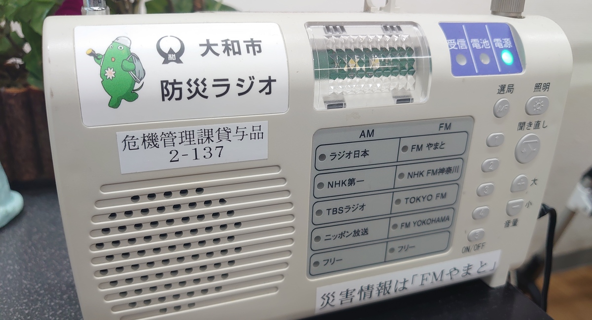 大和市の危機管理課より数年前から「防災ラジオ」が貸与され設置しております。大和市から防災情報が発せられると、自動的にラジオから情報が流れる仕組みのラジオです。